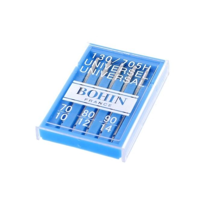 Boîte de 5 aiguilles machine à coudre universelles avec pointe légèrement arrondie pour une couture sans problème de nombreuses sortes de matières.