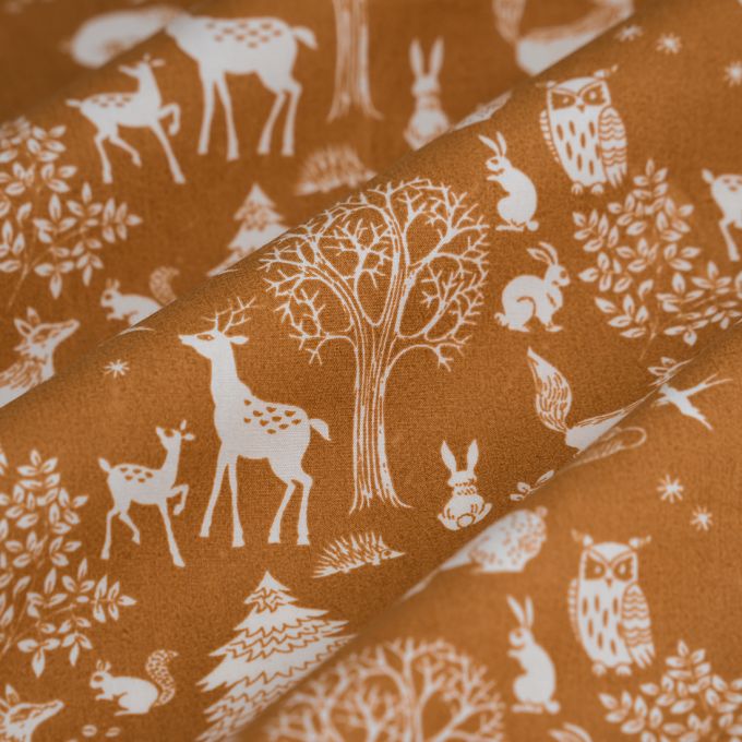 Découvrez un tissu qui évoque la magie de la forêt avec des illustrations d'animaux délicats sur un fond camel chaleureux. Ce tissu popeline en 100% coton est non seulement léger, mais il apporte également une touche d'originalité à vos créations.
