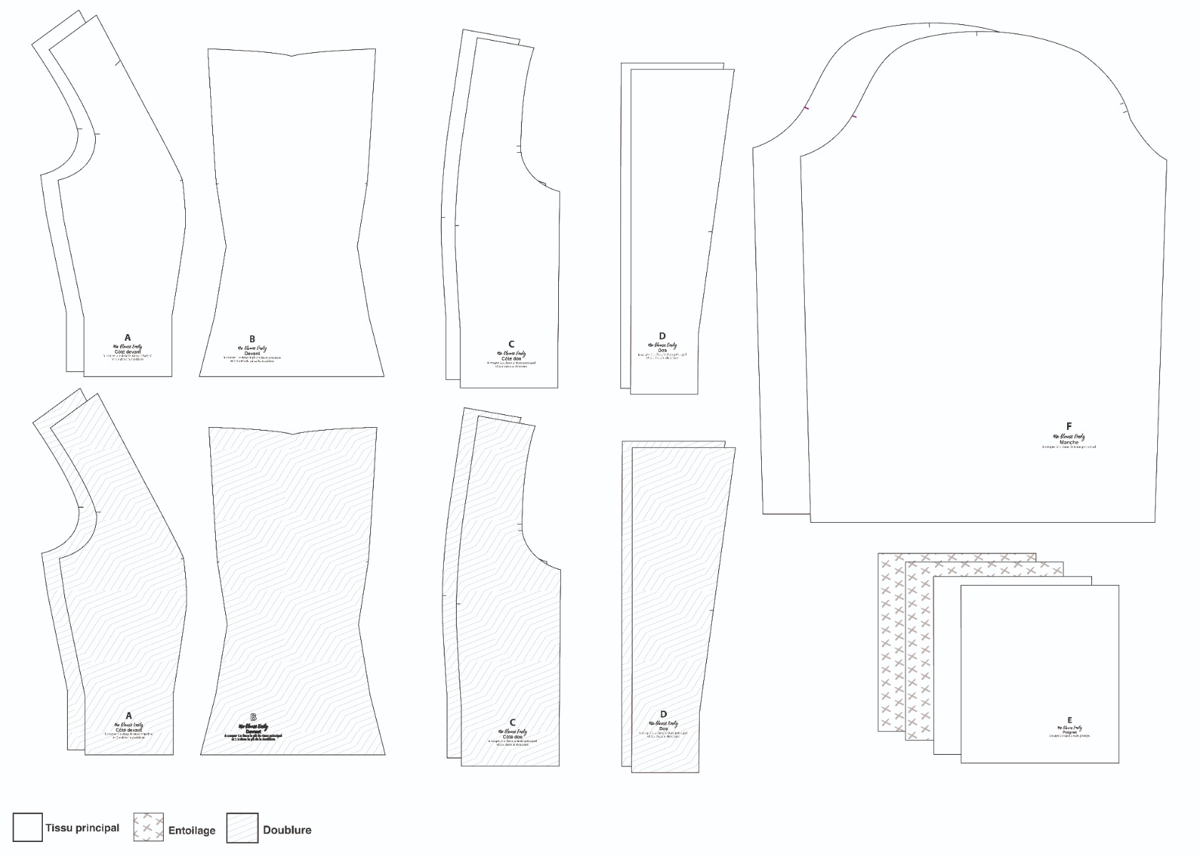 - La pièce D correspondant au dos de la blouse, à couper 2 fois dans le tissu et 2 fois dans la doublure