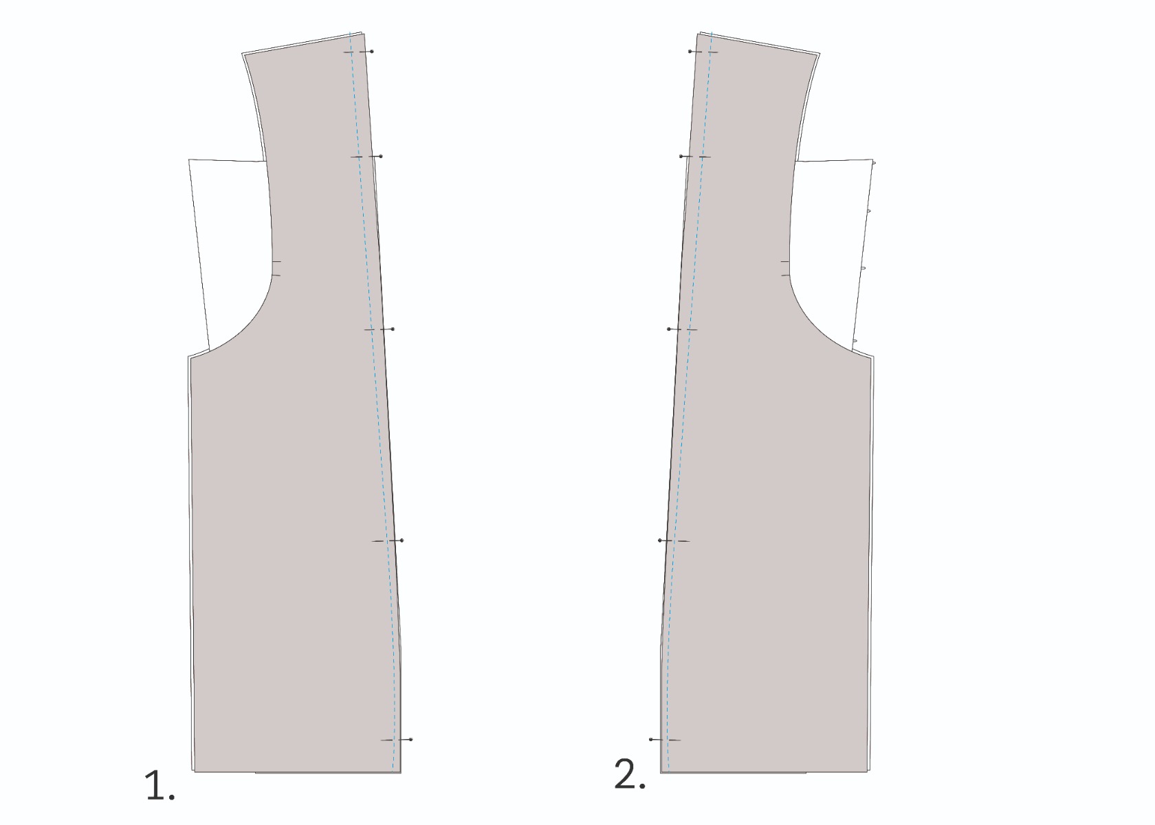 Épingler, endroit contre endroit, le côté dos avec le dos en veillant à faire correspondre les crans. Épingler ensuite la doublure du côté dos, endroit contre endroit avec le côté dos. Le dos est pris en « sandwich » entre les pièces (C). Coudre à 1 cm du bord en réalisant un point d’arrêt en début et en fin de couture (1). Renouveler cette étape pour l’autre dos (2).